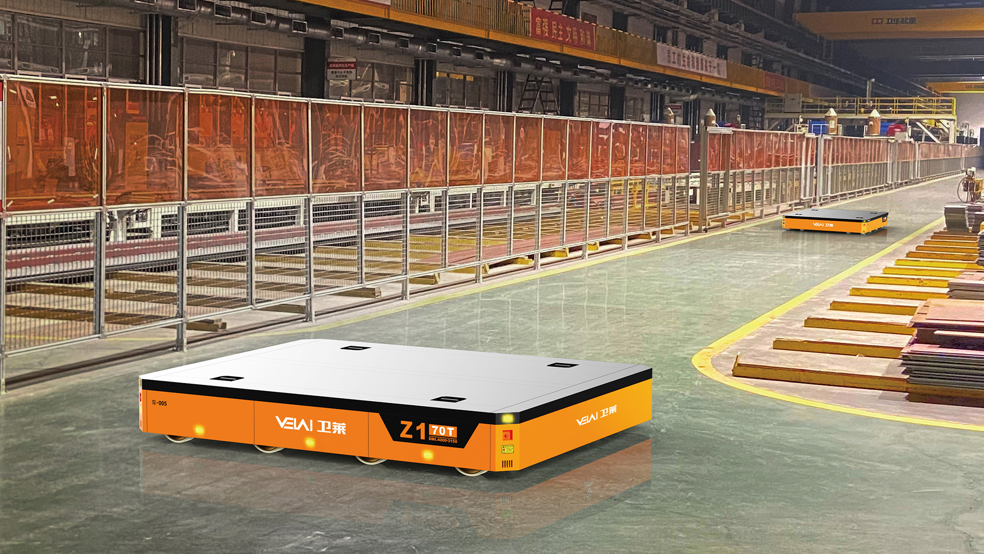 Z1-70t 型重載 AGV,可提供單車(chē) 70t 的負(fù)載能力,具有原地轉(zhuǎn)彎和橫移功能,特別適合用于大尺寸、大噸位工 件的運(yùn)輸??稍跒r青、自流平、混凝土地面上運(yùn)行,具有很強(qiáng)的地面條件適應(yīng)能力。由于其自身具有整車(chē)自頂升 功能,除可用于直接承載工件外,還可通過(guò)鉆入工件架并進(jìn)行自頂升,托舉工件架后間接承載工件。根據(jù)用戶(hù)要 求,多 AGV 可實(shí)現(xiàn)同步聯(lián)動(dòng),用于托舉大型部件。采用 PGV+ 二維碼的復(fù)合導(dǎo)航模式全自動(dòng)運(yùn)行,也可以遙控 運(yùn)行。