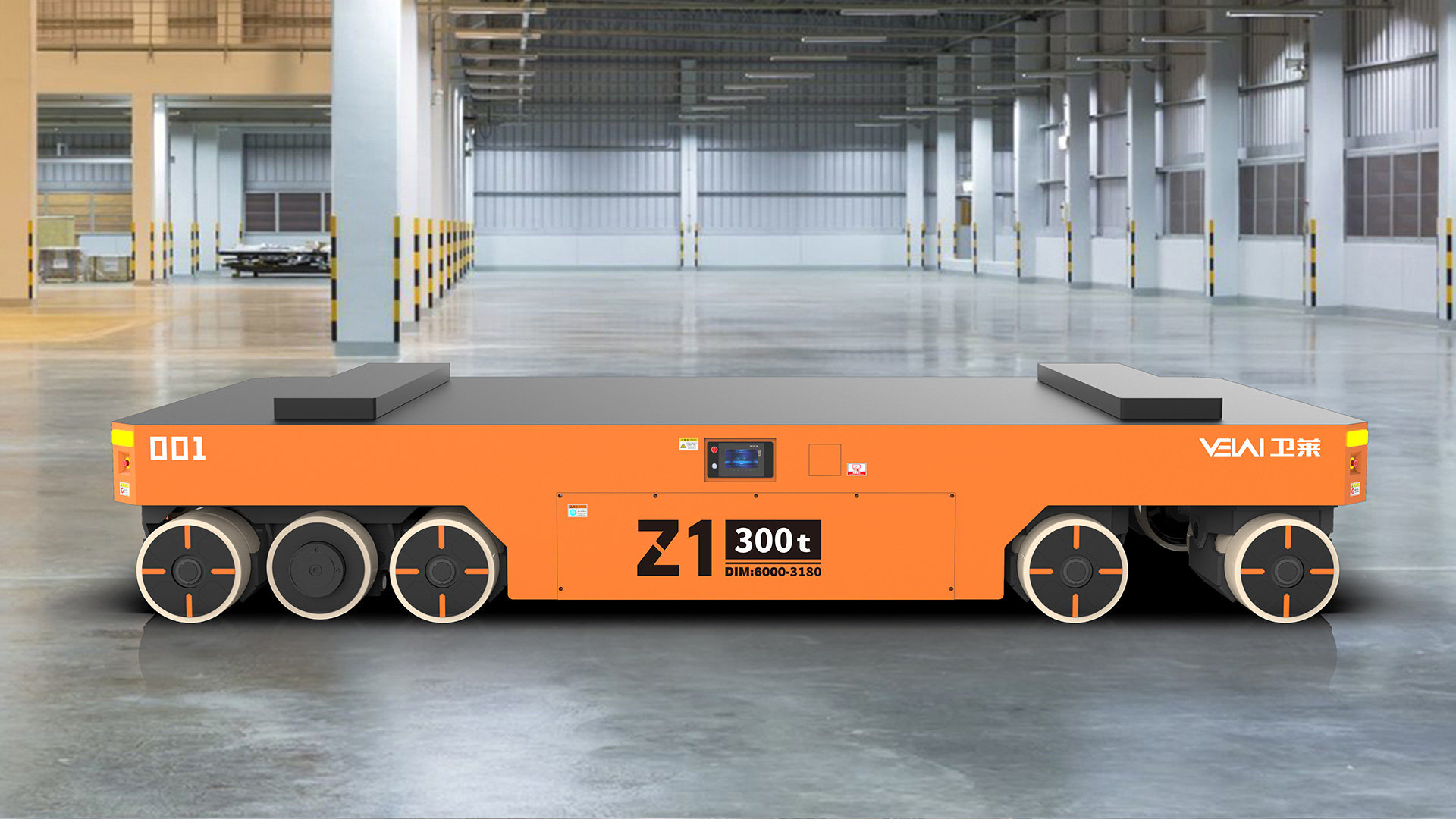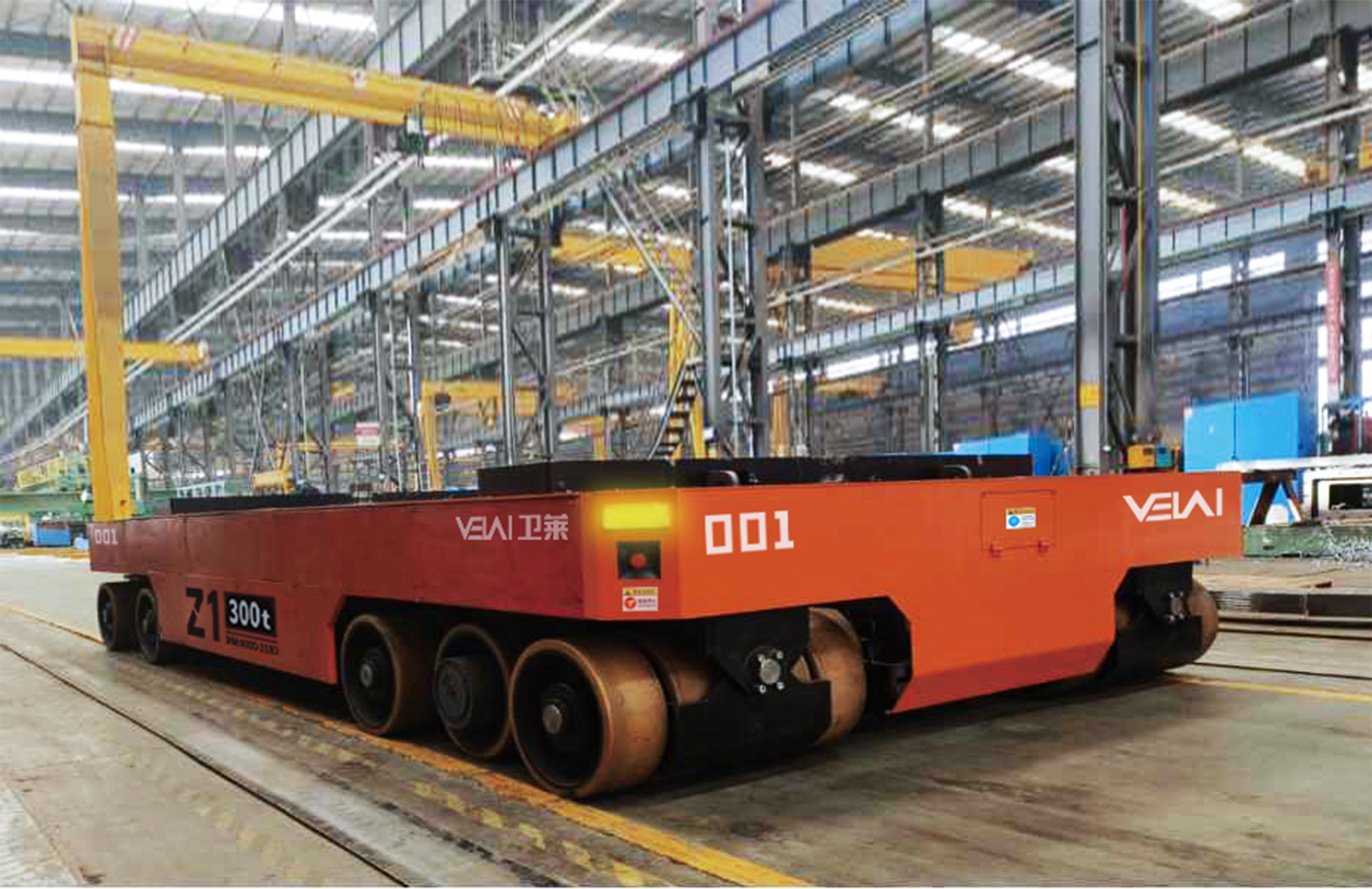 Z1-300t 型重載 AGV,可提供單車 300t 的負(fù)載能力,具有阿克曼轉(zhuǎn)彎功能,越野能力強(qiáng),特別適合用于大尺寸、 重工件的運(yùn)輸??稍跒r青、自流平、混凝土地面上運(yùn)行,具有很強(qiáng)的地面條件適應(yīng)能力。由于其自身具有整車 自頂升功能,除可用于直接承載工件外,還可通過鉆入工件架并進(jìn)行自頂升,托舉工件架后間接承載工件。根據(jù) 用戶要求,多 AGV 可實(shí)現(xiàn)同步聯(lián)動,用于托舉重部件。采用 PGV+ 二維碼的復(fù)合導(dǎo)航模式全自動運(yùn)行,也可以 遙控運(yùn)行。